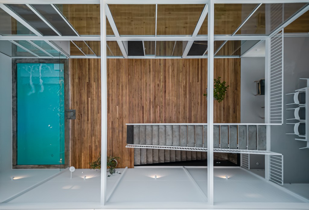 Outside, explore one of the property’s most spectacular features – the double-height central courtyard, which craftily creates an ‘L’-shaped gallery to the fully tiled magnesium pool. Whether it’s this or the oversized pale sunshine entry door adding a ‘pop’ to the home’s pared back facade, this Torrens Park haven brings the right amount of cool, Cali vibes to suburbia.