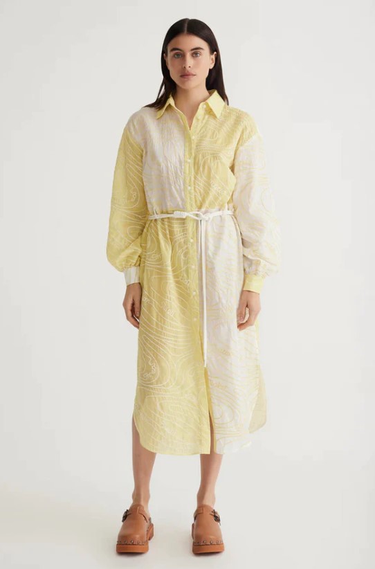 Bottom, left to right: Antipodean Surge Belted Shirt Dress in Zest, $725, Denim Iniquity; La Tribe Knotted Platform Slide in Milk, $289.90, Denim Iniquity.